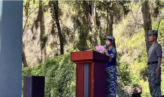 初中段教导处主任助理兼年级组长张亿万老师深情寄语,勉励全体新生珍惜这次难得的机会,以抗战先烈和阅兵官兵为榜样,发扬"精益求精,问鼎人生"的精神,认真完成每一项训练任务。