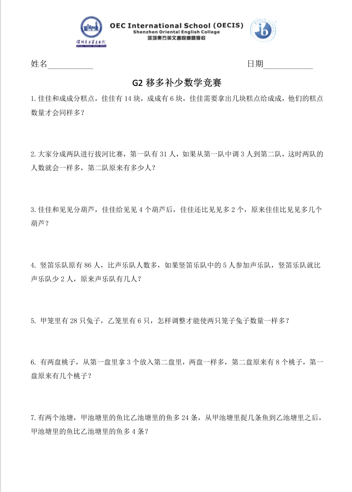 根据二年级小朋友的思维特点,本次竞赛我们选择了《移多补少》这个主题进行探究。该内容趣味性强能够很好地激发学生的学习兴趣,竞赛的方式更是为本次的主题探究活动锦上添花。考虑到孩子们还处于直观形象思维阶段,我们尝试引导学生以小组为单位在现实情境中感知、分析、合作、探究数学知识,从而发展学生的核心素养培养孩子会用数学的思维思考现实世界。