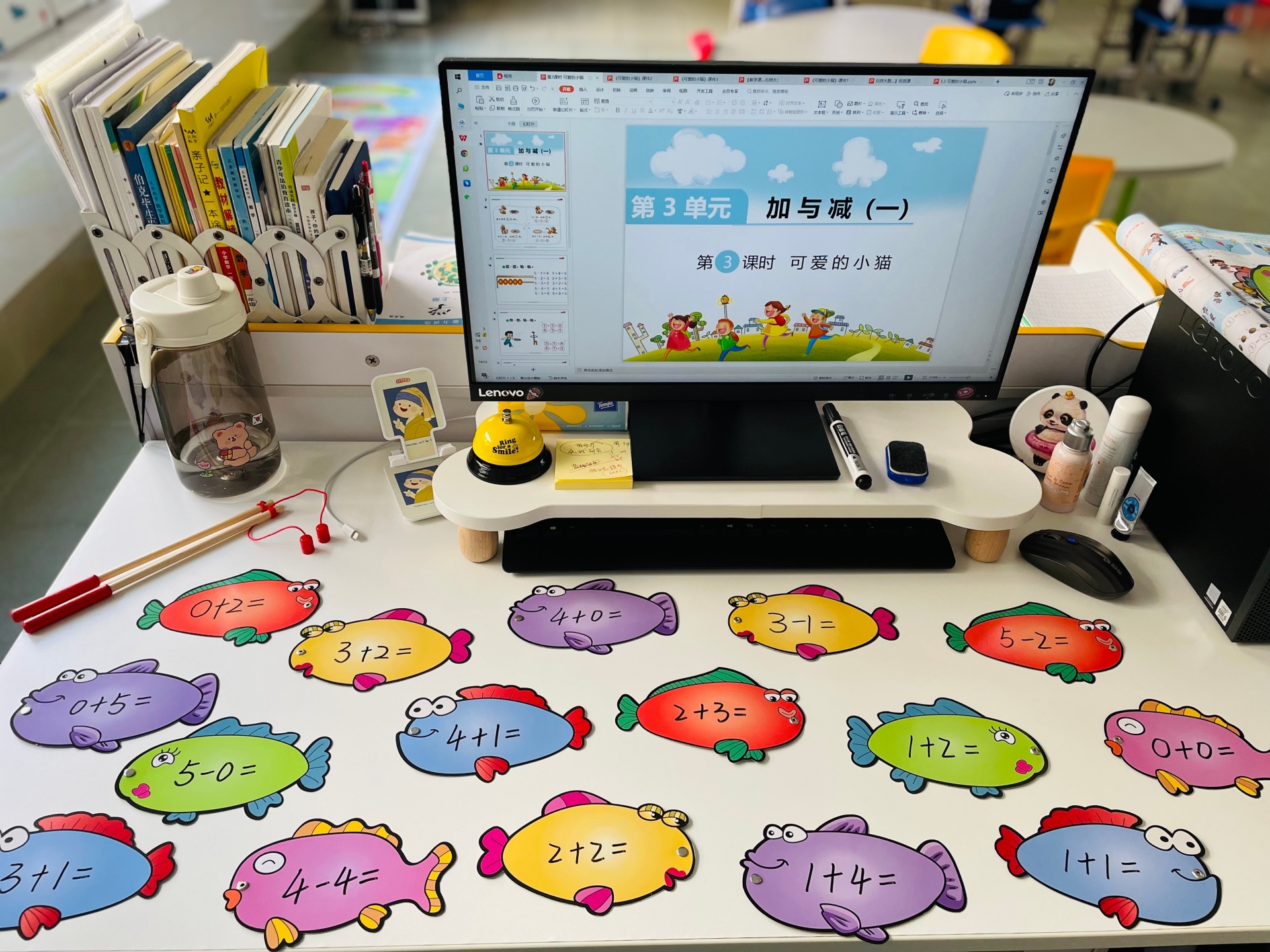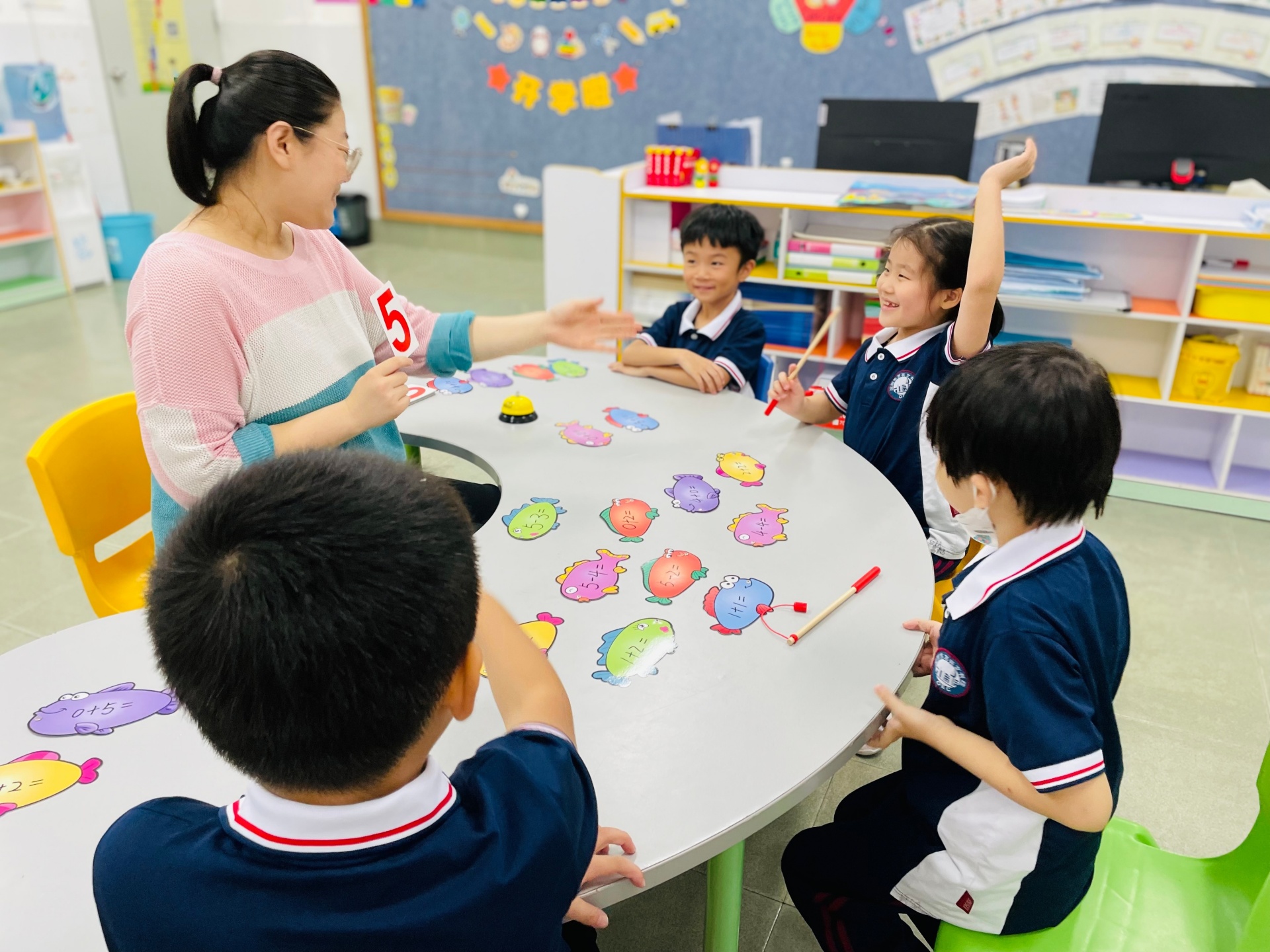 通过创设游戏化场景激发一年级学生的学习兴趣,培养学生的专注力,同时巩固所学知识。“小猫钓鱼”活动是为了帮助学生巩固5以内加减法:将5以内的加减法算式写在小鱼卡片上,老师出示算式得数,学生将符合条件的式子“钓上来”。
