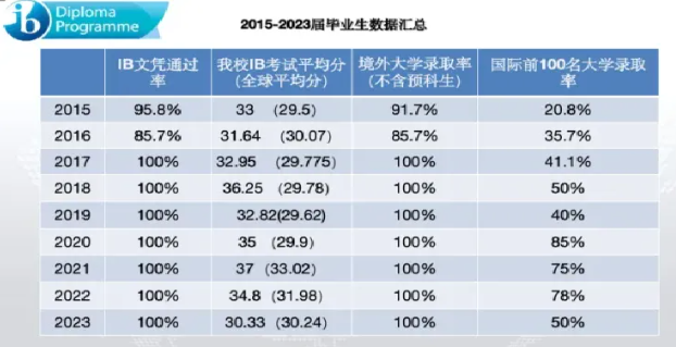 自2004年获得DP授权以来,毕业生IB全球统考文凭通过率接近100%,50%毕业生入读世界前50名大学,如香港大学、香港中文大学、香港理工大学、帝国理工大学、爱丁堡大学、伦敦政经学院、悉尼大学、墨尔本大学、多伦多大学、莫纳什大学、曼彻斯特、谢菲尔德等世界名校,多名学生获得高额奖学金。