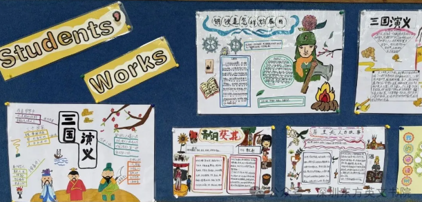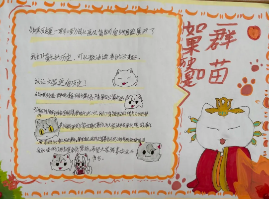 每一块蓝板,都藏着阅读课的巧思。——《尼尔斯骑鹅旅行记》里 “如何理解成长中的蜕变” 的讨论笔迹稚嫩却真诚,《如果历史是一群喵》中对 “历史人物与时代故事” 的关键词提炼旁,还画着孩子们笔下灵动可爱的猫咪形象。这些内容正是阅读课上 “文本分析”“主题探究” 环节的延伸,让课堂上思考的问题在蓝板上继续生长。