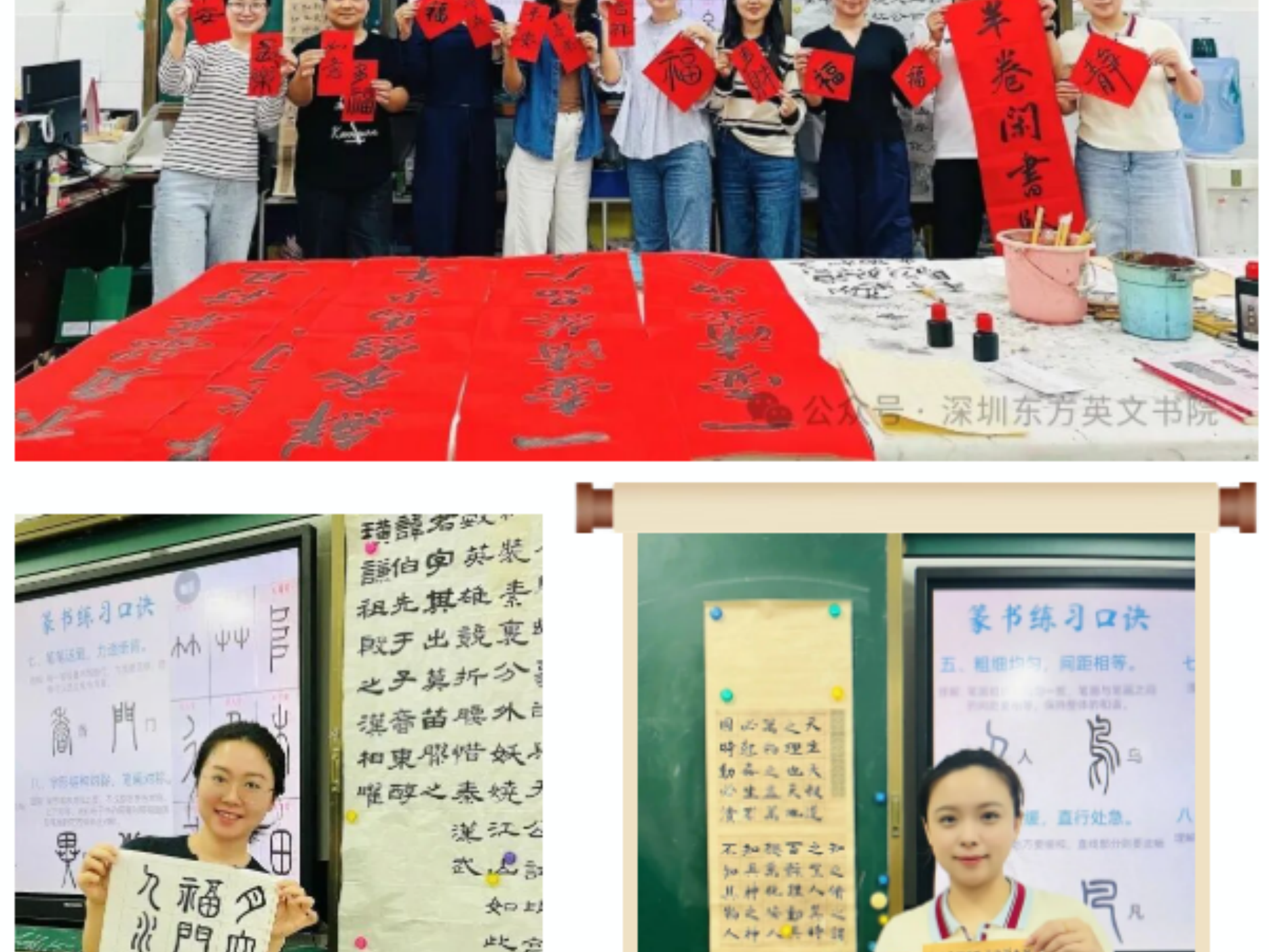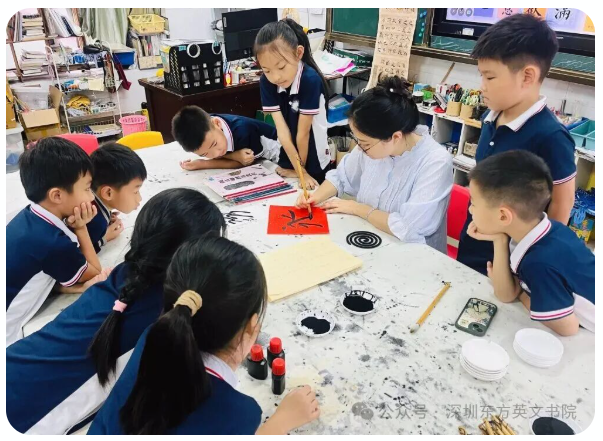 国际部有不少爱好书法的老师,她们的办公桌上总摆着一本练字本,课间也会随手写上几笔。“和孩子们一起练字,是双向成长的过程。” 李老师笑着说,“有一次我写‘福’字,想尝试篆书的写法,结果孩子们围过来好奇地问‘老师,这个字怎么和平时不一样呀’,我就趁机给他们讲篆书的特点,看着他们眼里的求知欲,我自己也更有动力钻研书法了。而且孩子们的专注特别有感染力,有时候我练得有些浮躁,看到他们一笔一画认真的样子,心就静下来了。”