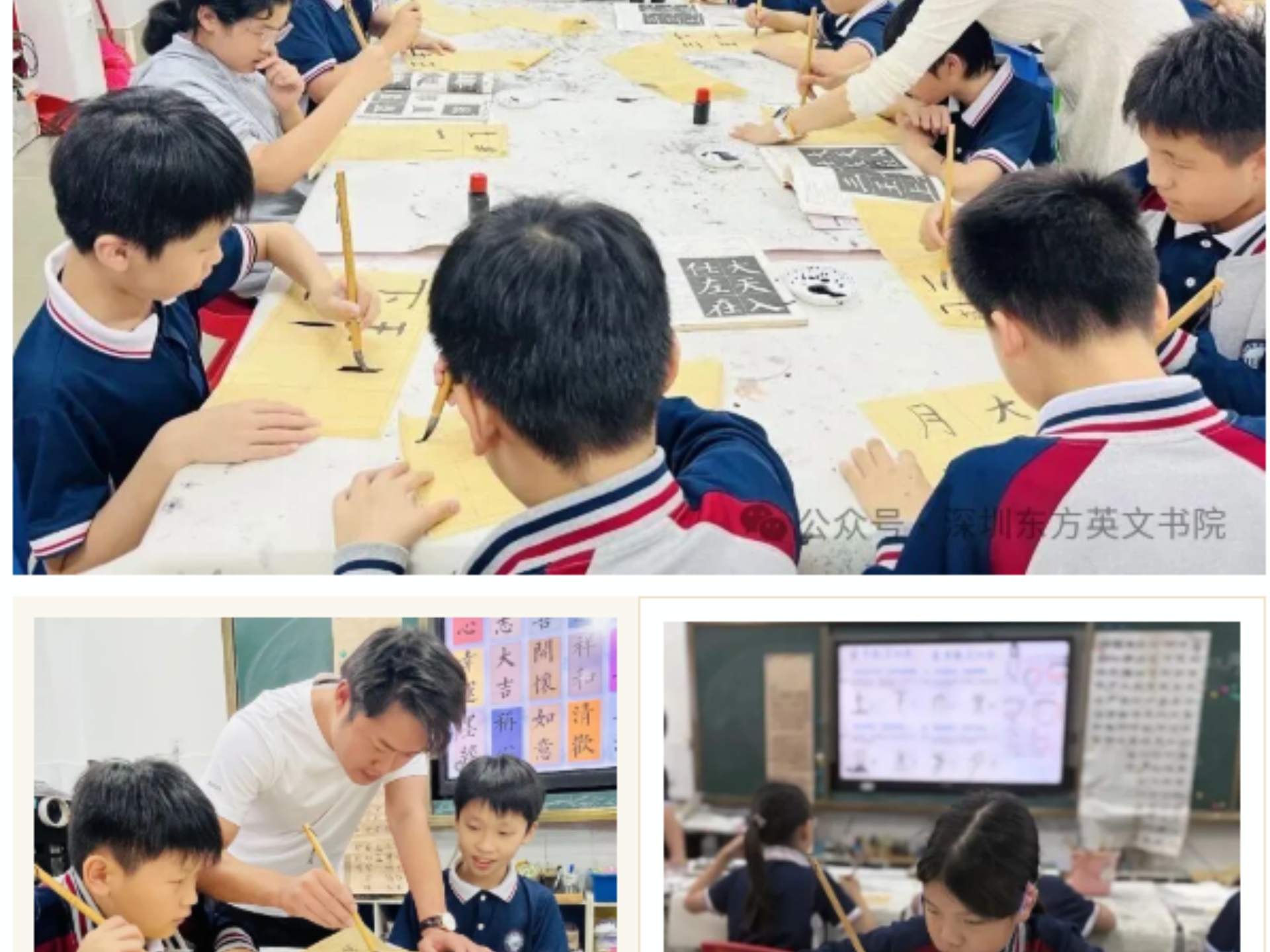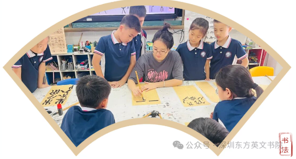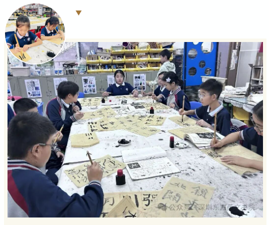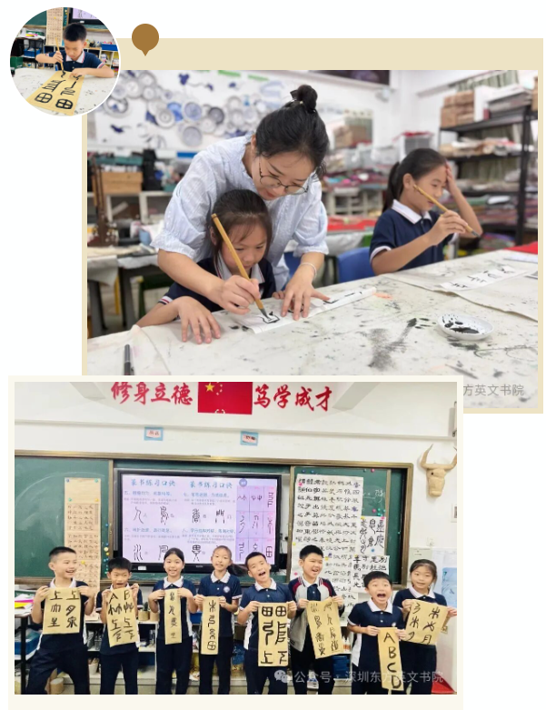 课桌前,同学们的模样格外可爱:三年级的小萌娃踮着脚尖,小手紧紧攥着毛笔,一笔一画跟着老师 “画” 字,墨汁偶尔沾到指尖,也只是咧着嘴笑;四五年级的同学已经能坐得笔直,眼神专注地盯着笔尖,遇到写不好的笔画,就举起宣纸向老师请教;六年级的学长学姐则多了份从容,写完后还会主动帮身边的同学调整握笔姿势,整个教室满是 “沙沙” 的落笔声和轻声的交流声,温暖又治愈。这不是一次普通的书法课,而是国际部 “师生共练毛笔字” 活动的日常写照。