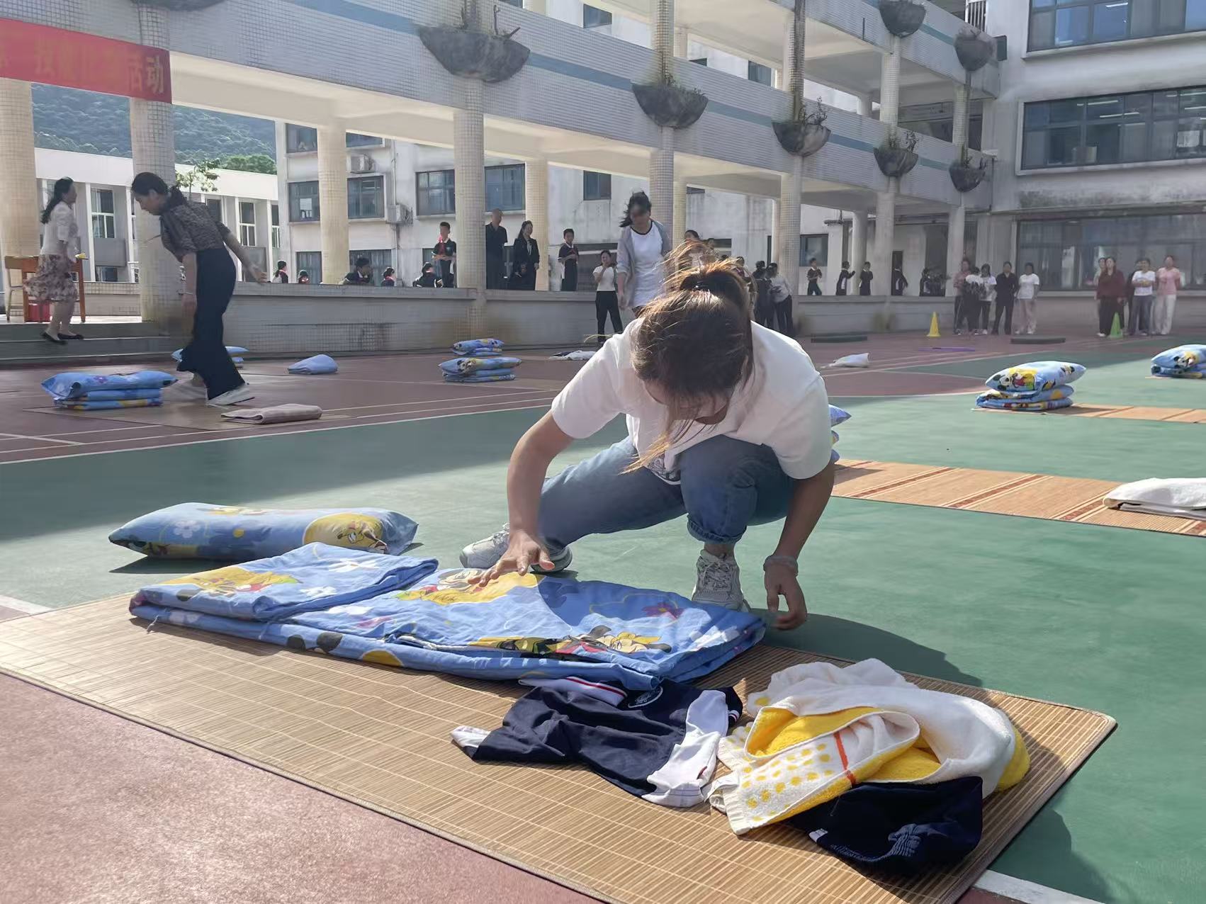 比赛在活泼而有序的氛围中开展。老师们通过抽签分为四组,依次完成翻滚、呼啦圈接力等趣味热身项目,随后迅速投入叠被子、摆枕头、整理凉席及包校服浴巾等实操环节。赛场上,老师们动作娴熟,细节精准;被子叠得棱角分明,物品摆放整齐划一,充分体现了日常工作的扎实功底。特别值得一提的是,由学生组成的评委小组认真观察、公正打分,不仅增添了比赛的趣味性,也让师生角色互换,共同见证了老师们的专业风采。