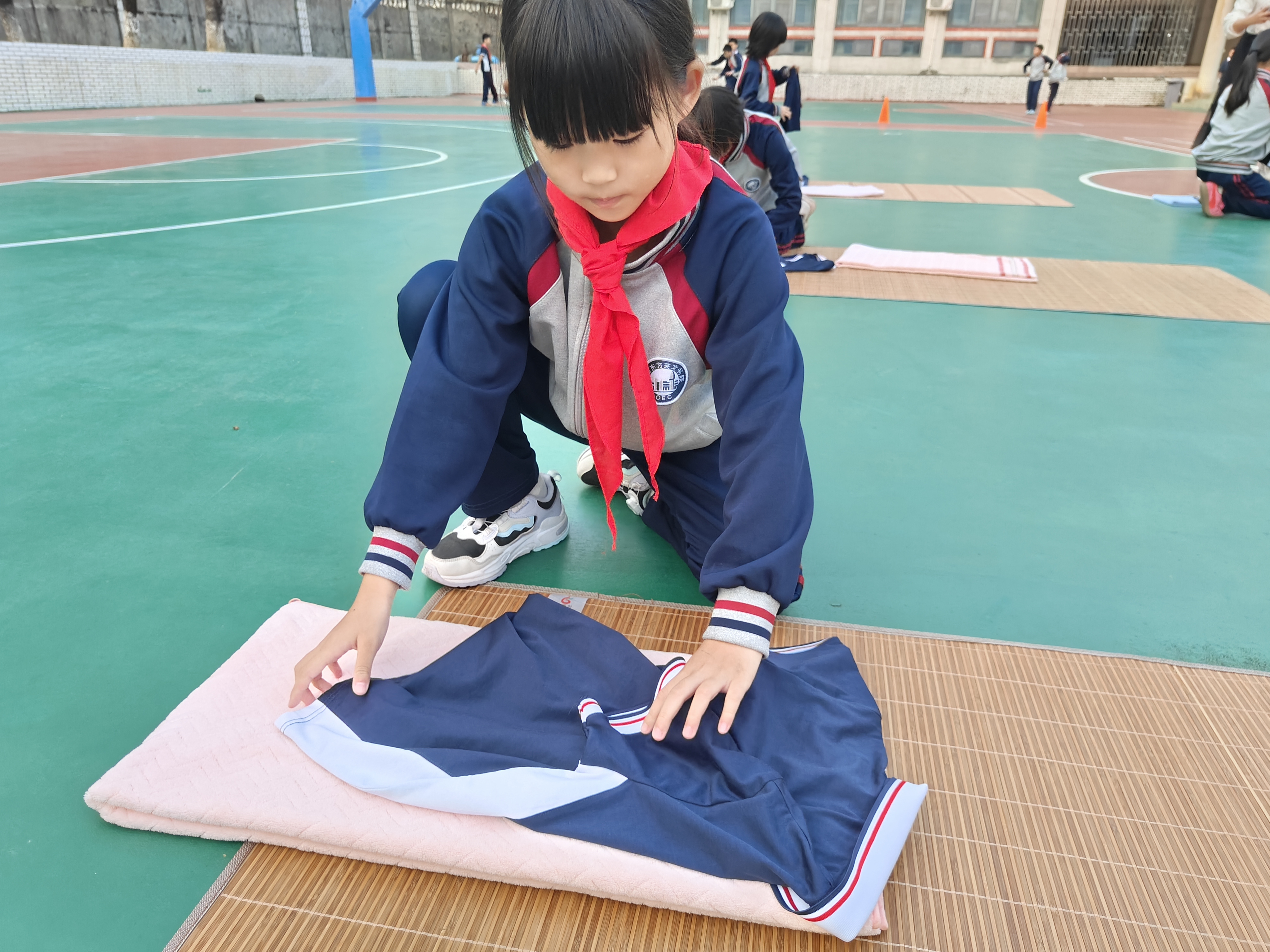 竞赛项目根据不同学段特点精心设计:一、二年级进行穿校服、戴红领巾比赛;三、四年级开展包浴巾、折叠校服项目;五、六年级则挑战叠被子、摆枕头等更具难度的任务。赛场上,低年级学生动作稚嫩认真,高年级同学操作娴熟、有条不紊。
